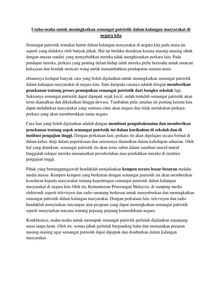 Untuk mendapatkan penulisan karangan yang baik pelajar perlu melakukan latihan tambahan sama ada daripada guru atau inisiatif sendiri. Langkah Memupuk Semangat Patriotik Dalam Kalangan Masyarakat.